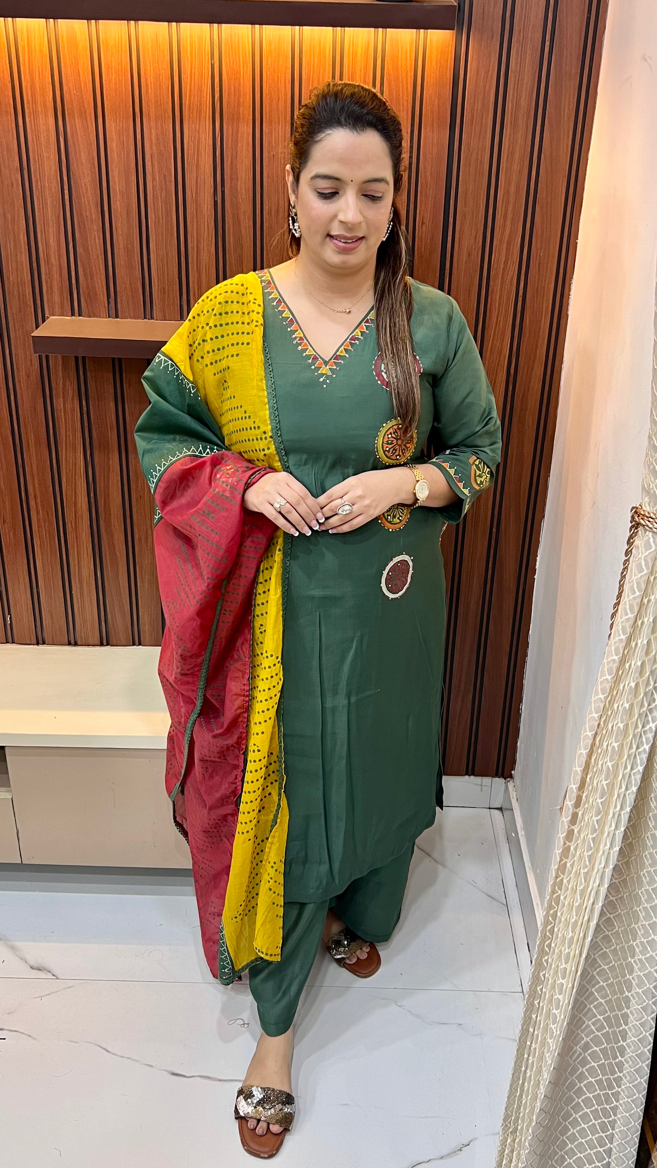 Celebrate artisanal elegance with this beautifully crafted block print suit, designed to blend tradition with everyday functionality. The kurta features classic block print motifs, enhanced with delicate sequin accents and intricate Kantha (Kanta) work for rich texture and handcrafted charm. Thoughtfully designed pockets on both sides of the shirt add modern convenience without compromising on style.