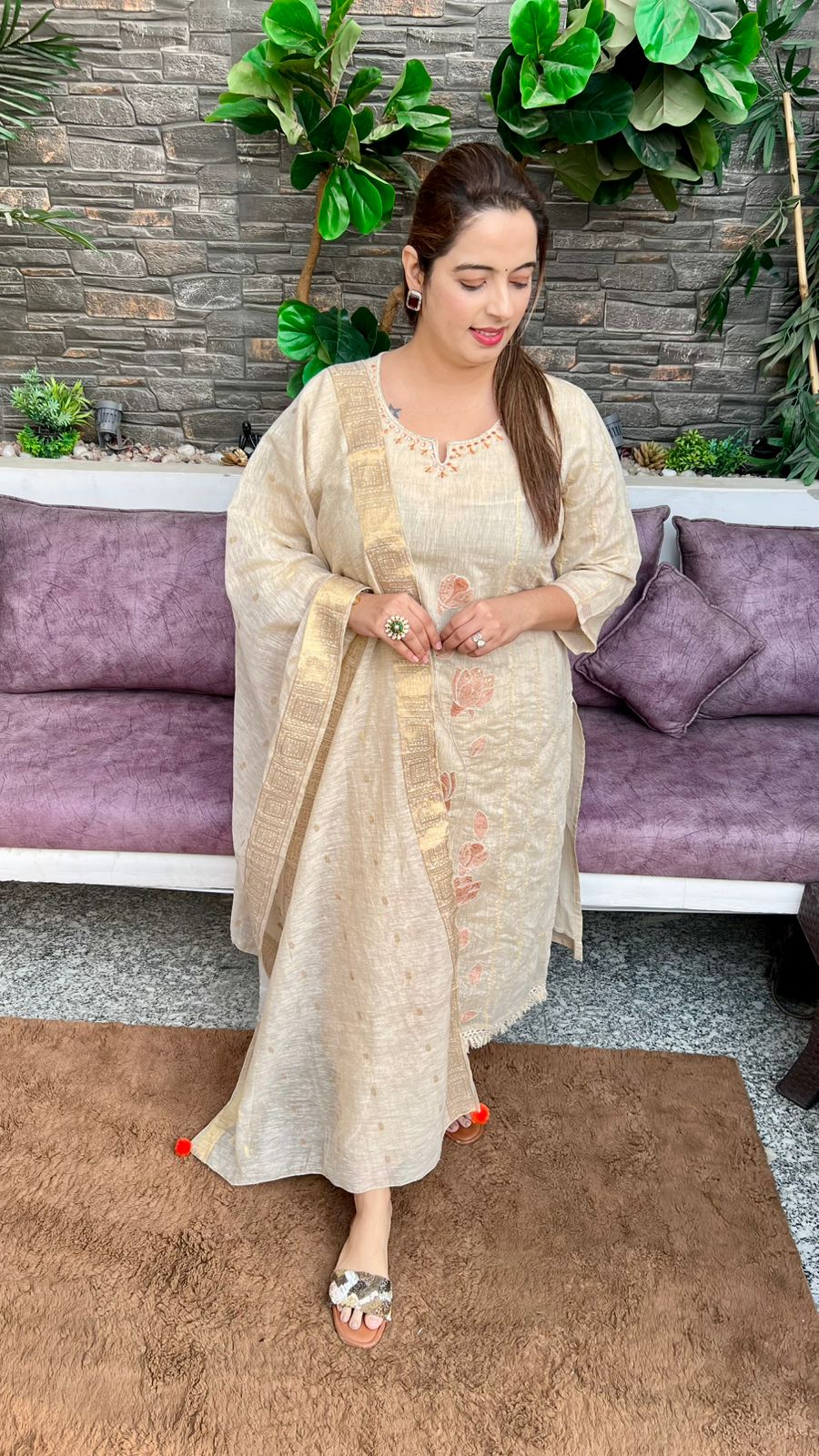 Elegant Maheshwari silk suit featuring a soft cotton lining for comfort, paired with a cotton Banarasi dupatta adorned with intricate hand embroidery. A perfect blend of traditional craftsmanship and everyday elegance, ideal for festive and special occasions.