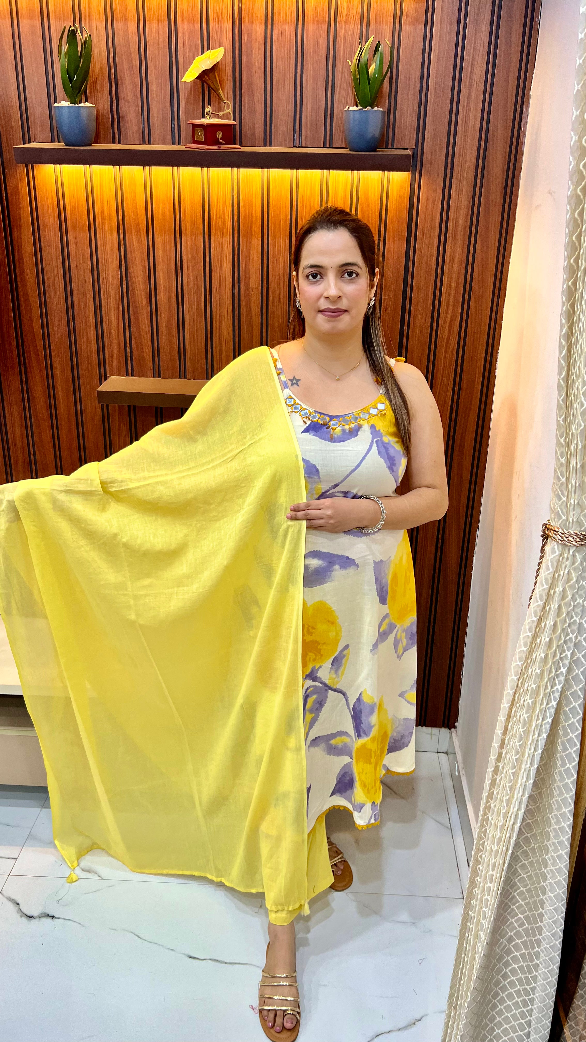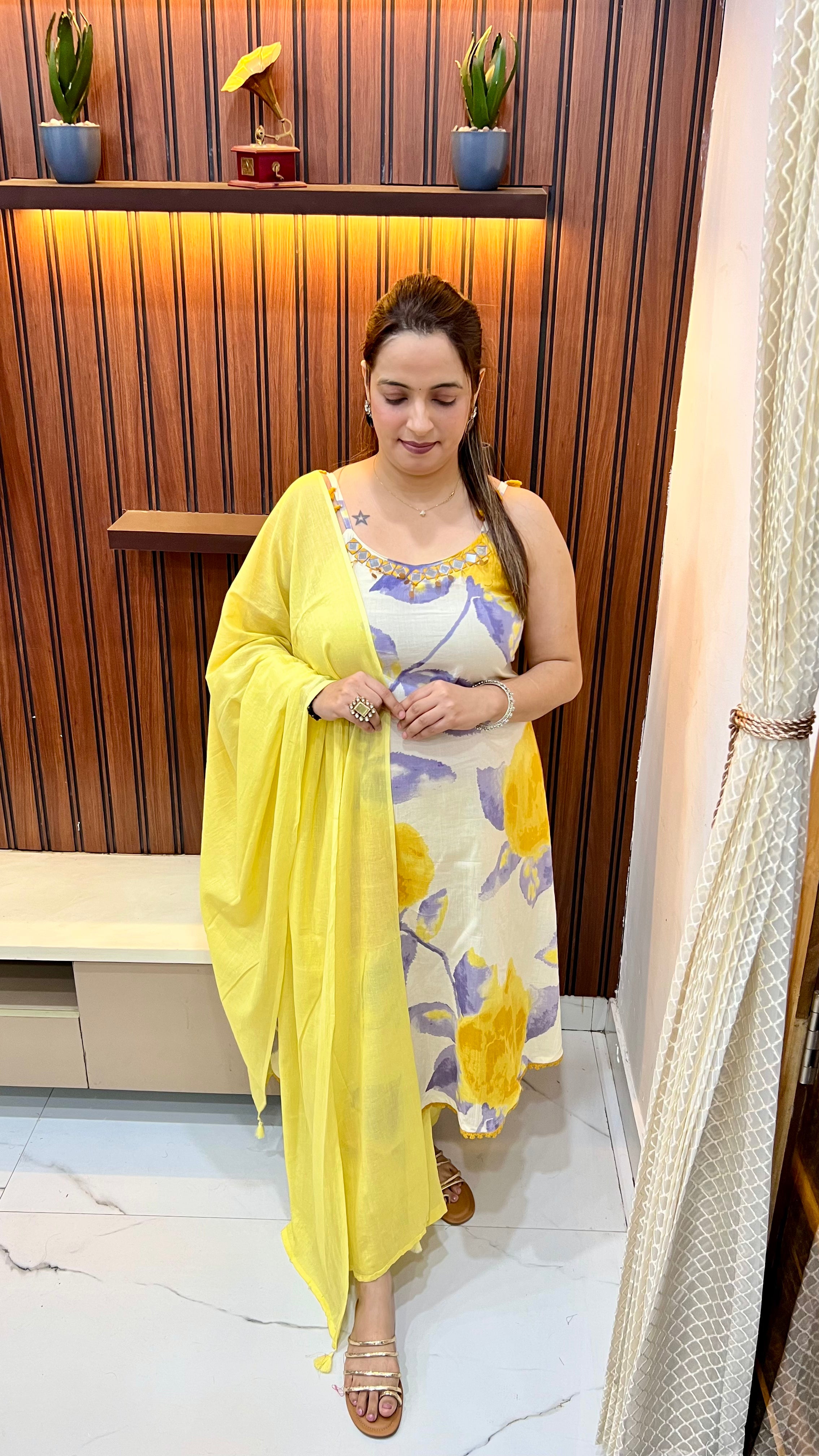Pure Cotton Floral A-Line Suit (Model Wearing Size L) — Mirror Work with Adjustable Straps
