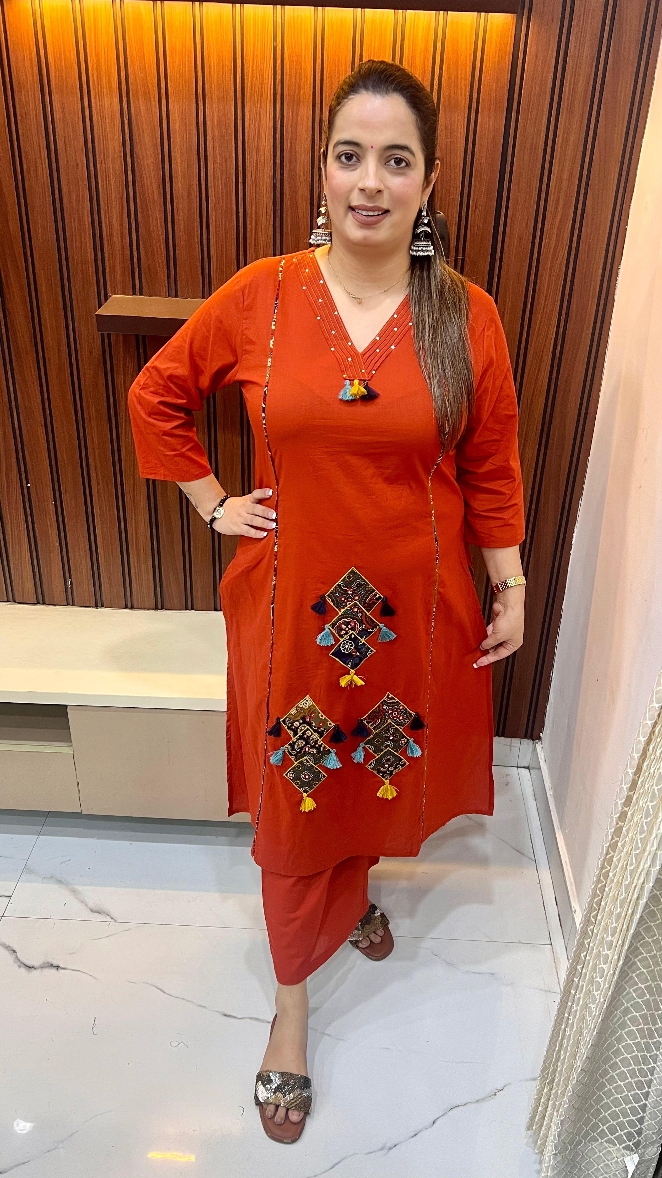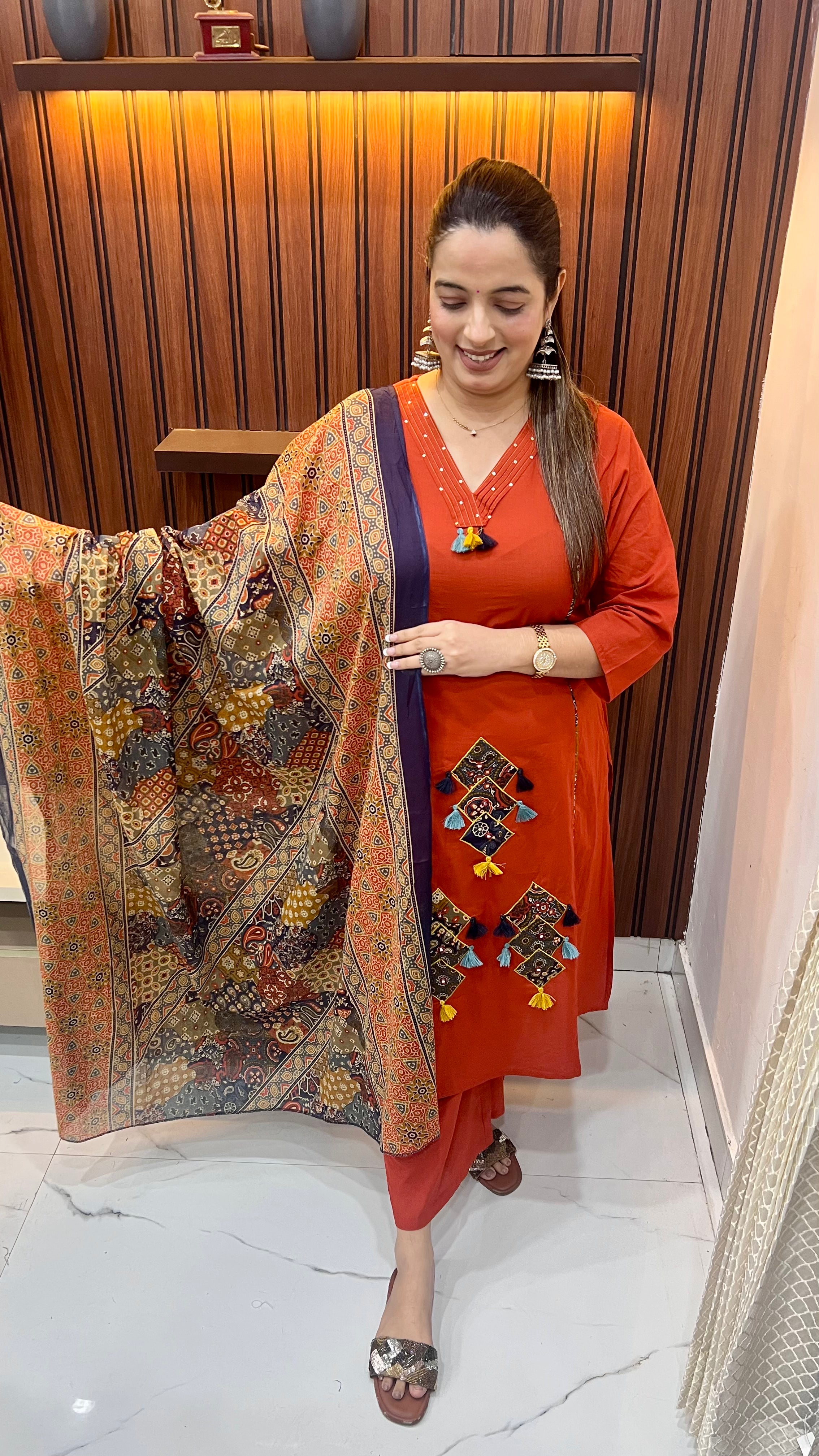 Celebrate artisanal elegance with this beautifully crafted pure cotton suit, designed for comfort and timeless style. The kurta features a flattering princess cut silhouette, enhanced with delicate appliqué and sequin work that adds subtle shimmer. Kalamkari piping lends a traditional handcrafted touch, while the vibrant multicolour dupatta finished with handmade tassels completes the look with graceful movement and charm.