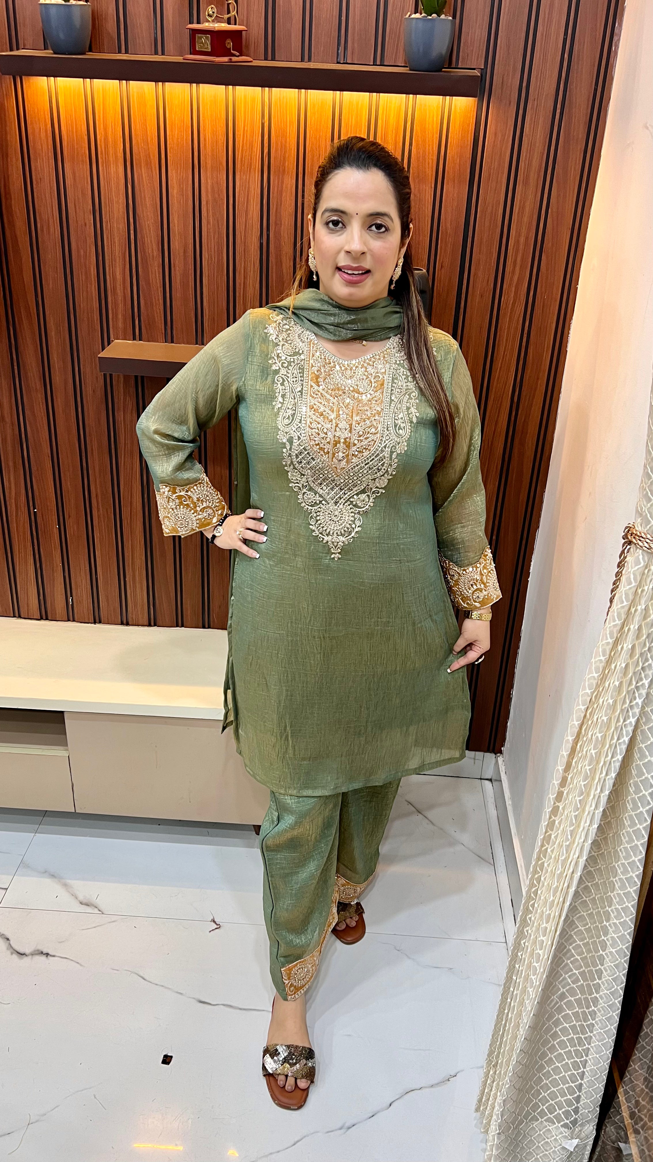 Step into graceful luxury with this stunning Organza Shimmer Suit, designed to make an elegant statement. The luminous organza fabric is beautifully enhanced with intricate appliqué work, while the sleeves feature detailed embellishment that adds refined charm and visual interest. Finished with a pure cotton lining for comfort and structure, the ensemble is paired with a flowing sharara that completes the look with effortless grandeur.