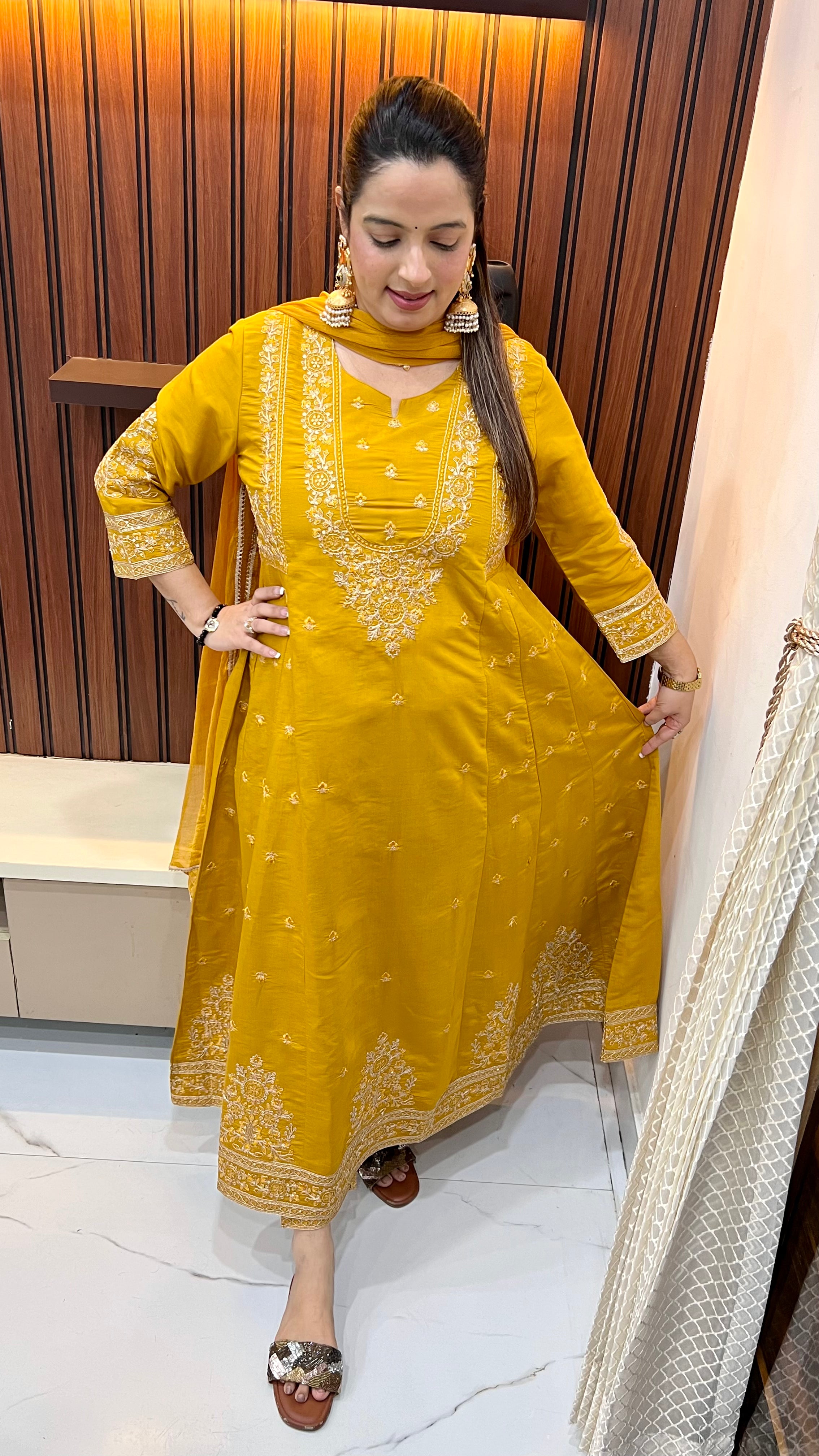 Embrace graceful elegance with this exquisitely crafted Mul Chanderi Anarkali, designed to flow beautifully with every step. The Anarkali features delicate detailing with elegant dori ties at the back, adding a refined, traditional touch. Paired with a soft chiffon dupatta and a comfortable mul bottom enhanced with subtle embroidery, this ensemble offers a perfect blend of lightness, luxury, and timeless charm.